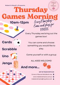 Every Thursday morning from 10-12 you can come along and play games for free. We have cards, jenga, scrabble, puzzles and more! Grab a group or come and meet some new friends.